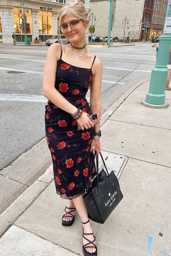 A black slip dress with red rose designs, stiletto heels, and a choker necklace make this outfit seductive for nightlife in the early 2000s.