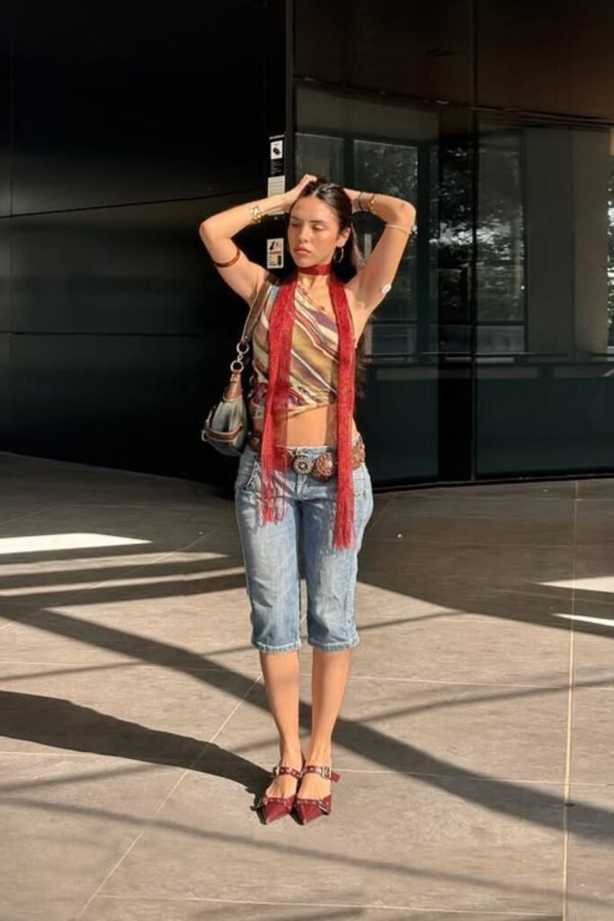 This outfit has the flirtatious confidence of 2000s street fashion: a silky scarf top, denim shorts that come to the knee, and a metallic belt with a red shimmer scarf on top.