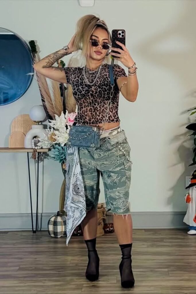 This outfit brings back that fearless street style from the 2000s: a sheer leopard blouse tucked over low-rise camo bermudas with a bandana dangling from the belt.