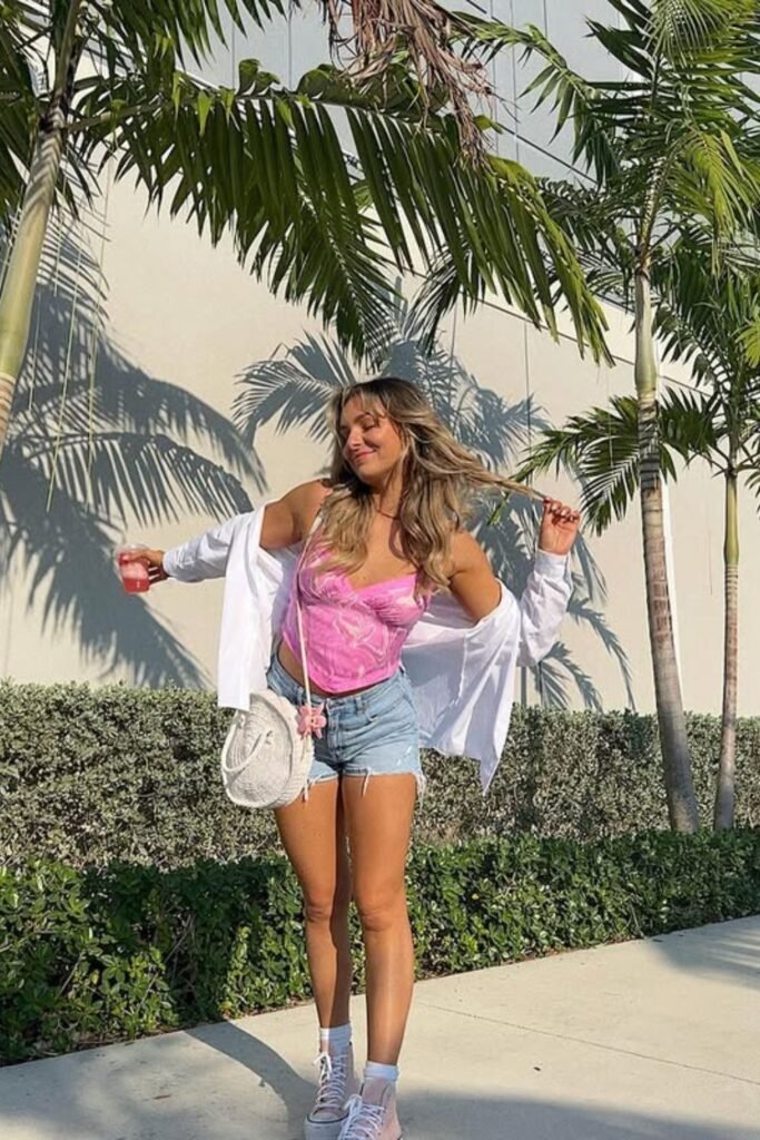 The hot-pink corset top goes with denim shorts and an oversized white shirt worn loose for a relaxed look.