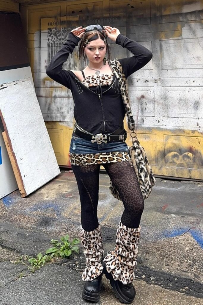 The leopard mini skirt, denim shorts, and fur leg warmers make a stunning layered look that shows off your confidence.