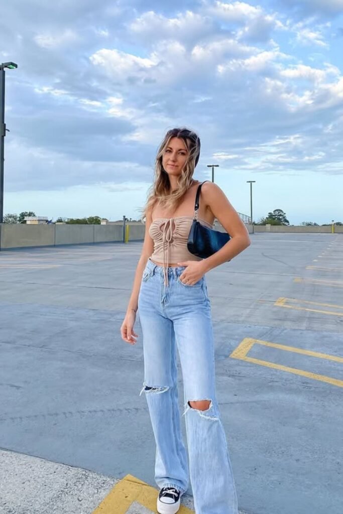 A ruched beige cami top, light-wash ripped jeans, and clunky sneakers make this ensemble look like a hip girl from the 2000s.