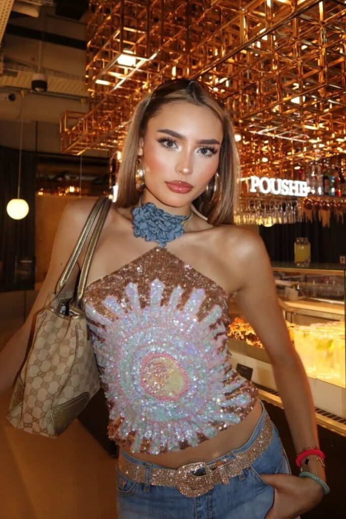 The Gucci shoulder bag and big hoop earrings give it a glossy look that is excellent for club nights or birthdays when you want to stand out.