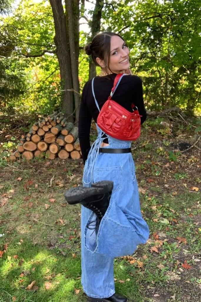 The bright red shoulder bag adds a Y2K touch of color and pulls the whole look together.