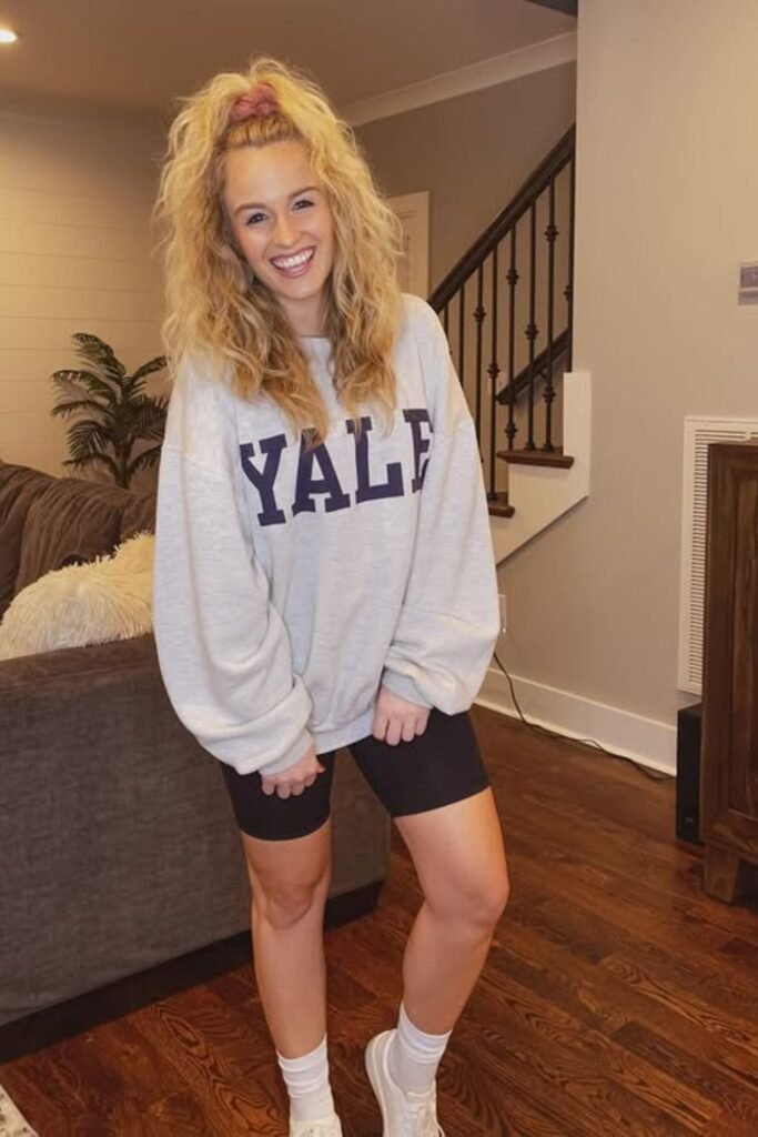 This outfit, which includes an oversized Yale sweatshirt, black biker shorts, white socks, and clunky sneakers, brings back the cozy Y2K vibe.