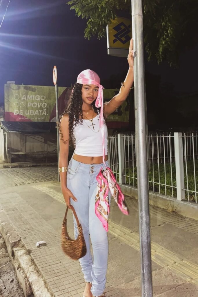 The fitting white crop top and low-rise light-wash trousers are paired casually with a pink satin durag and matching silk scarf knotted around the waist.