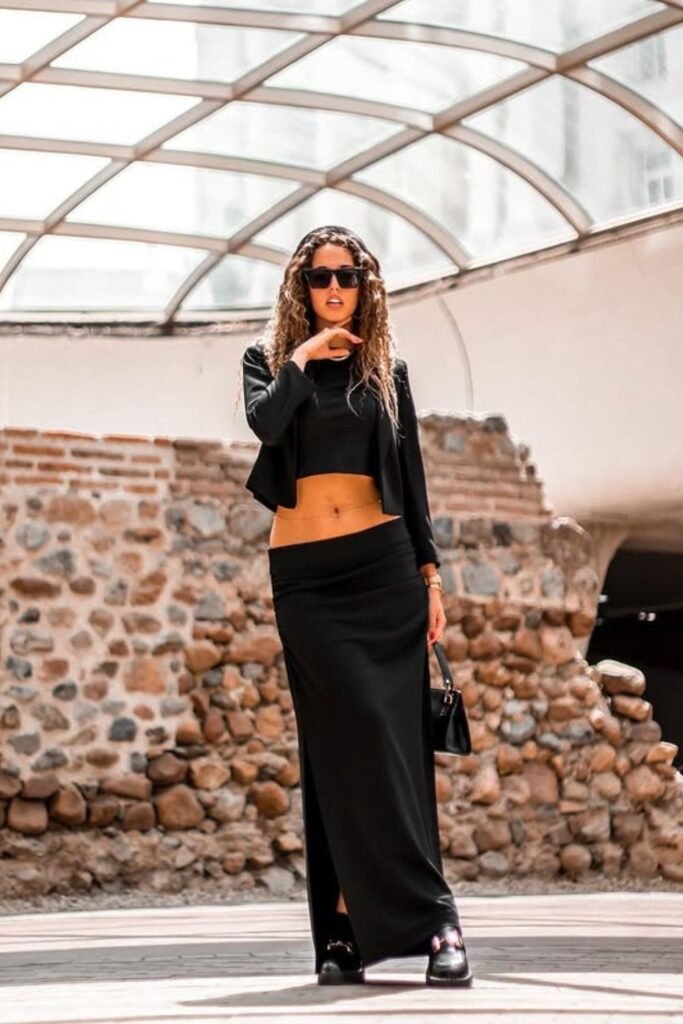 A cropped black shirt, a low-rise maxi skirt, a boxy jacket, and chunky shoes make up this outfit that shows off the dramatic side of 2000s minimalism.