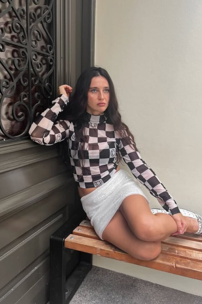 The checkered mesh top and white sequin mini skirt make this look daring for Y2K.