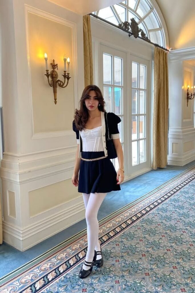 This outfit seems like something from a 2000s fashion magazine: a structured white corset top, a black mini skirt with a gold chain embellishment, and puffed short sleeves for a preppy-meets-glam style.