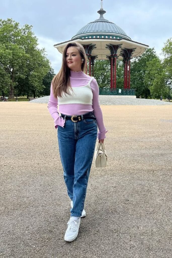 The lavender ribbed top under the white cropped cami gives you the fun Y2K contrast that used to be all over the place: girly, easy, and cool without trying.