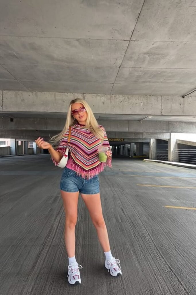 A crochet fringe poncho with denim shorts and big sneakers is the most laid-back look of the 2000s.