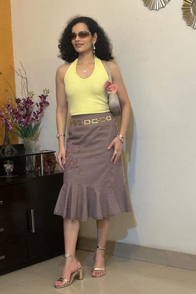 It has a yellow halter top tucked into a ruffled midi skirt with embroidered details and metallic heels.