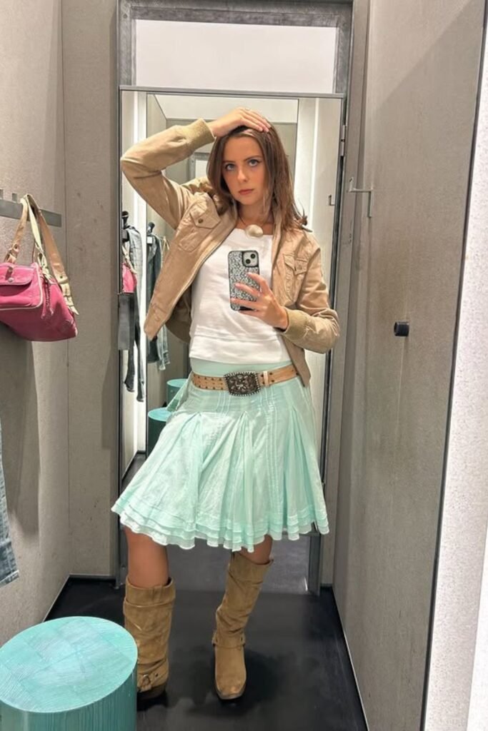 This ensemble perfectly represents the casual style of mid-2000s fashion: a mint-green flowy skirt, a white baby shirt, and a tan suede jacket with slouchy boots.