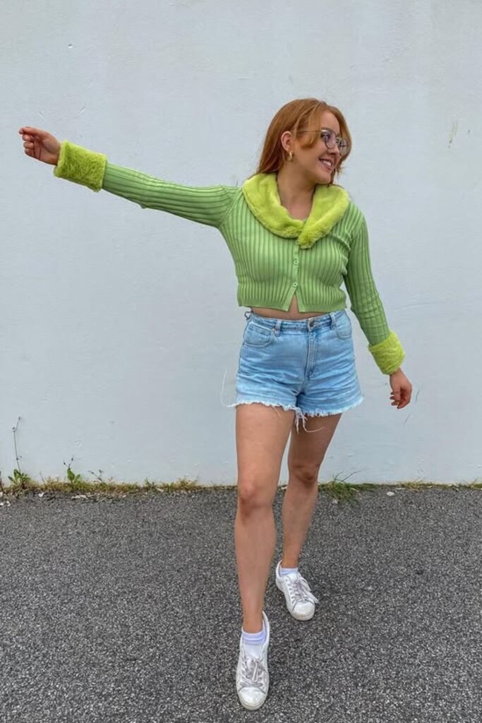The light-wash denim shorts keep it casual and easy to wear, while the lime-green cropped cardigan with fuzzy cuffs and collar gives off that classic Y2K texture moment.