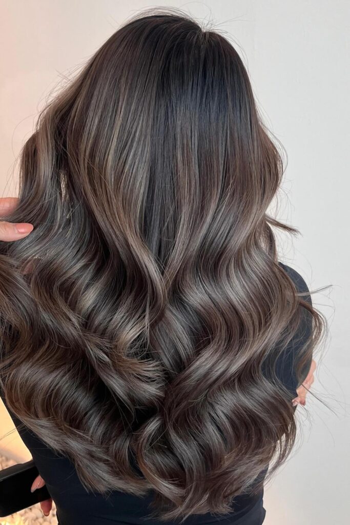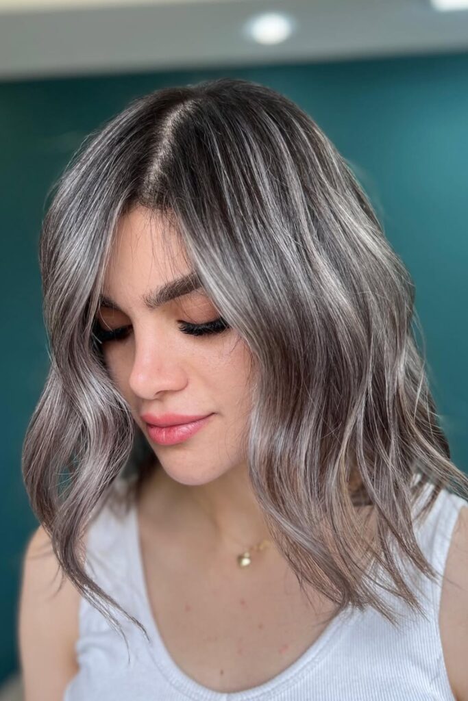 This hairstyle features a base of dark ash with strands of gray for a smokey balayage effect.