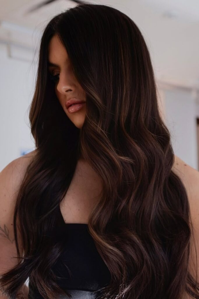 The subtle highlights enhance the hair’s natural depth, creating an effortlessly chic look.
