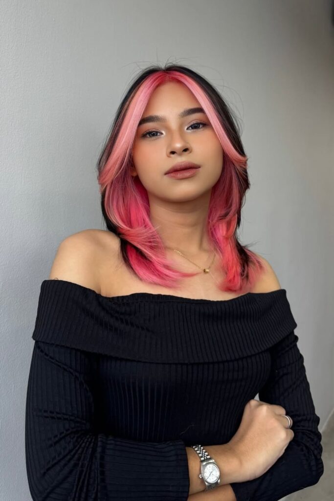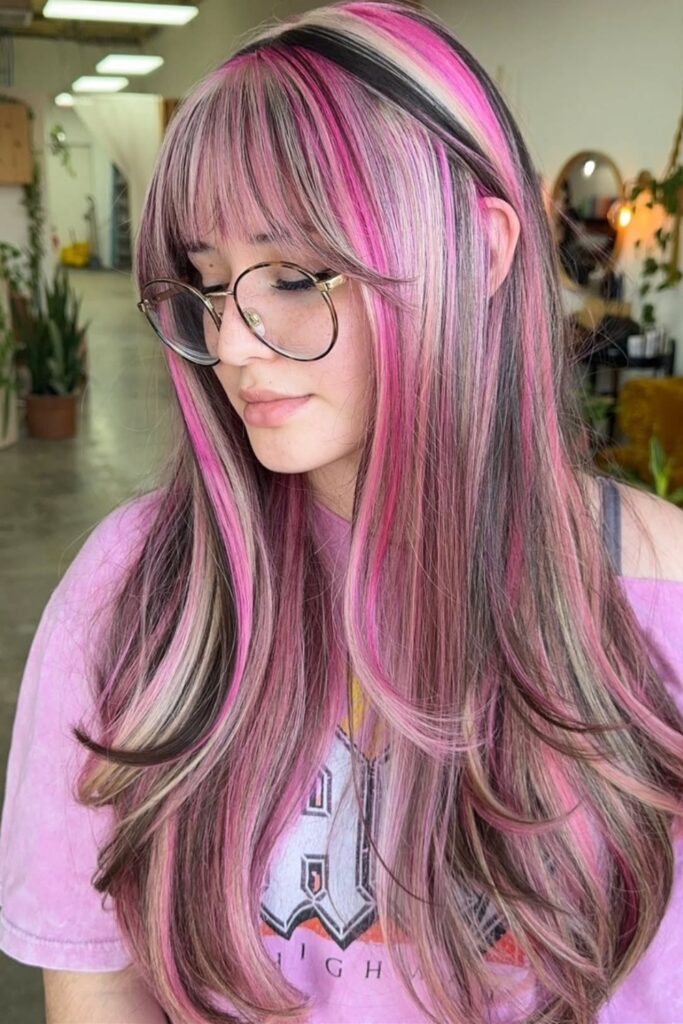 Featuring long, wavy hair interspersed with bold magenta stripes and subtle pink highlights, this style is both eye-catching and stylish.