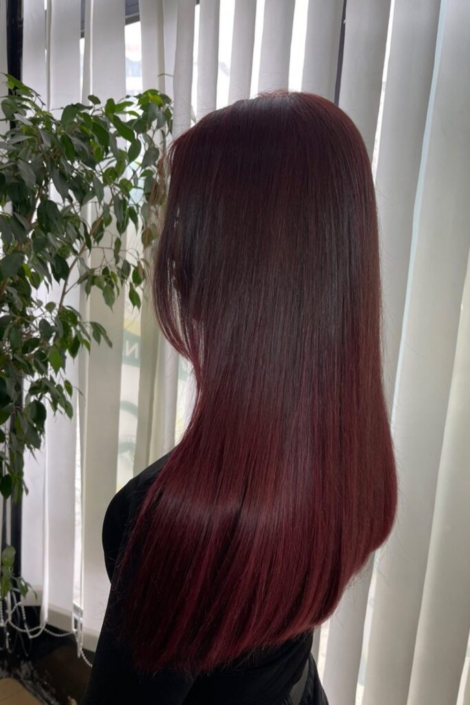 This straight, long hairstyle showcases a deep merlot shade that beautifully reflects light, offering a rich, radiant finish.