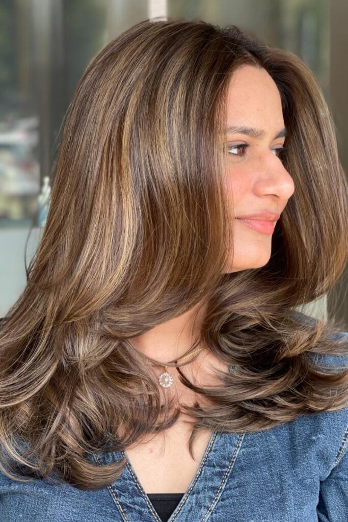 The long layers are styled with a slight curl at the ends to add movement and dimension.