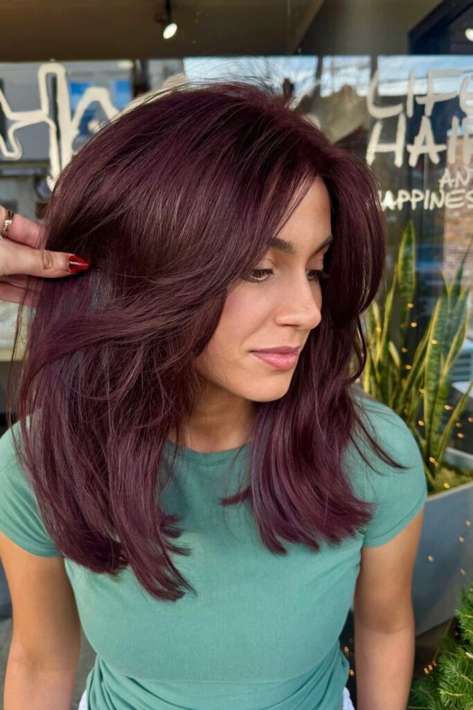 The soft waves and layered ends add texture and movement, emphasizing the rich plum tones.