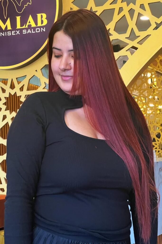 Long, sleek hair in a rich burgundy shade characterizes this look.
