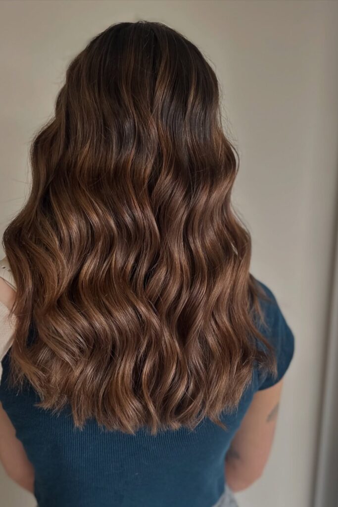 The soft waves add volume and movement, making this hairstyle ideal for anyone wanting to combine natural brunette tones with a hint of sun-kissed highlights.