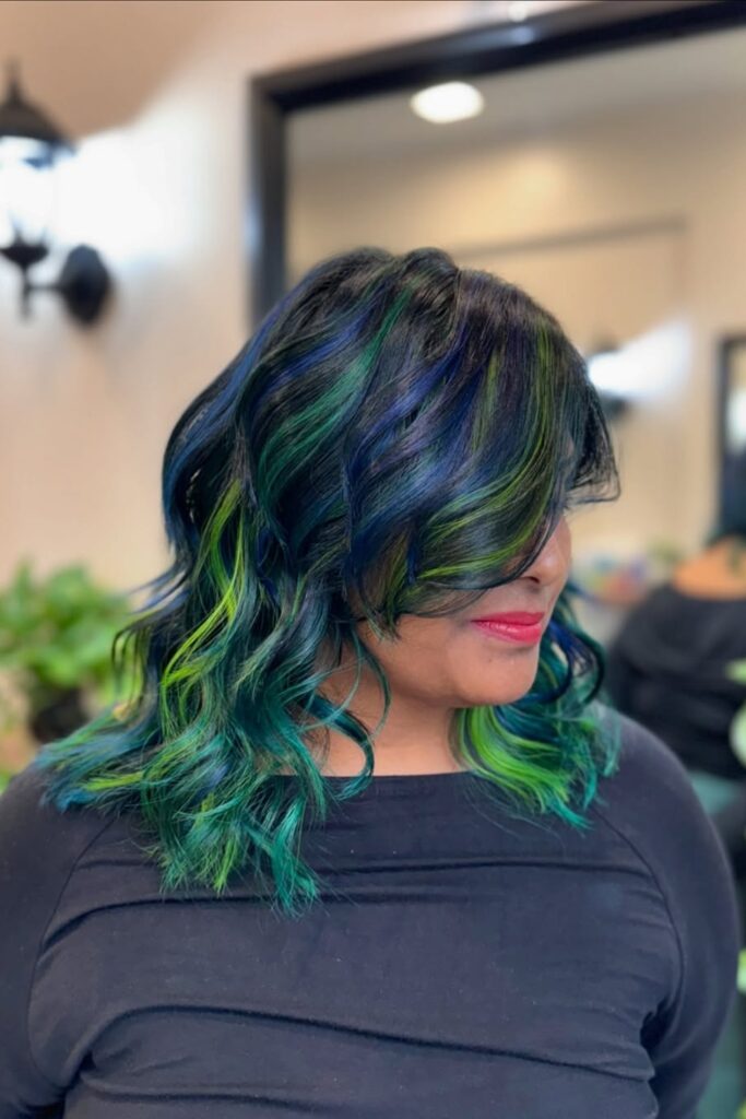 This short bob combines deep, dark roots with vibrant emerald ends, creating a stunning contrast that’s both bold and beautiful.