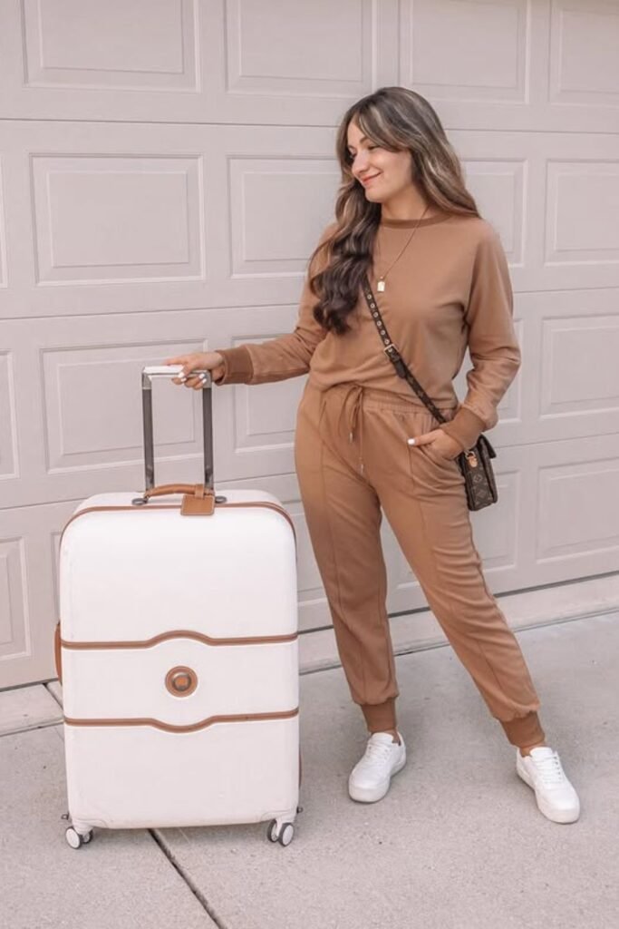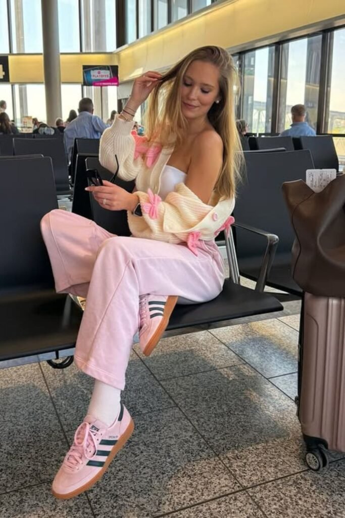 Soft colors and no work make long endpoints feel lighter. A matching pink sweatshirt and jogger combo will keep you calm while you board, sit, and walk quickly between gates.