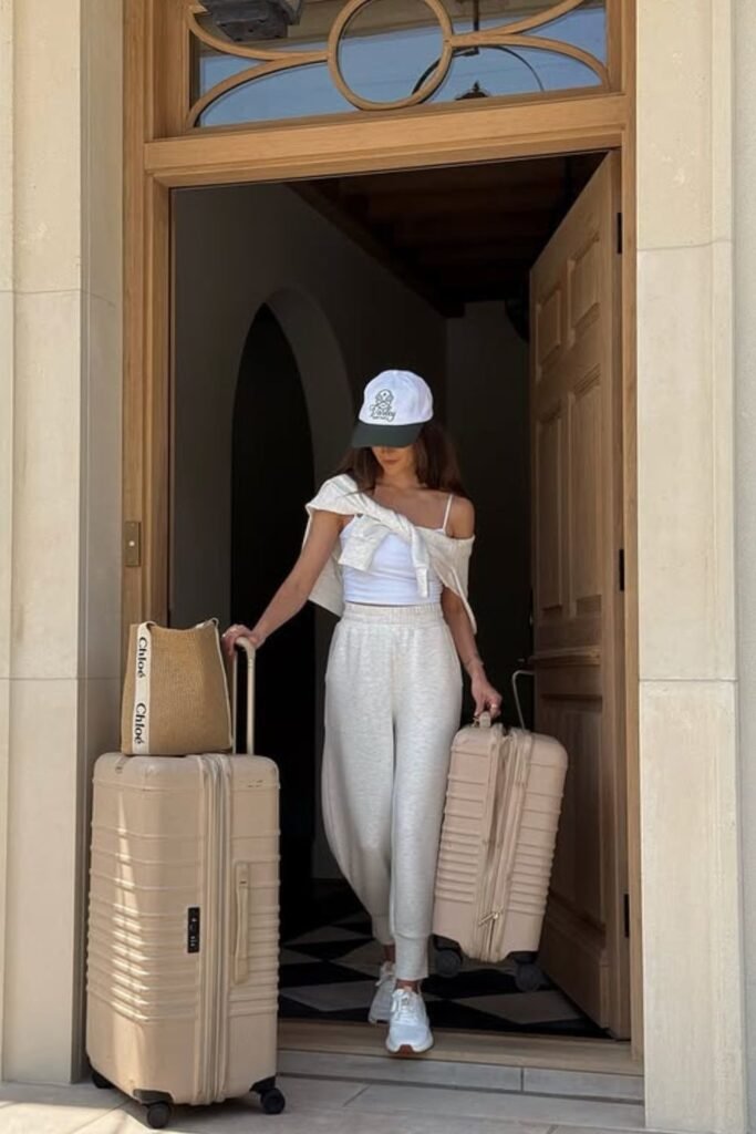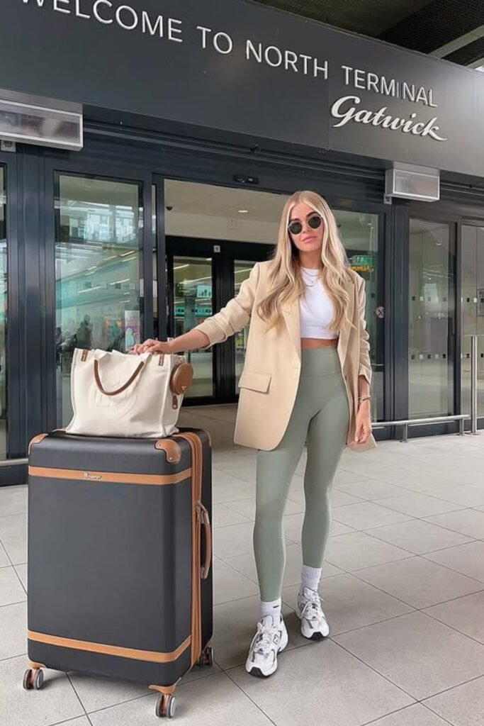 To get this look, stack a tailored layer over soft stretch bottoms, keep the colors quiet, and wear the shoes that are made for the real movement, not simply for taking pictures at the airport.