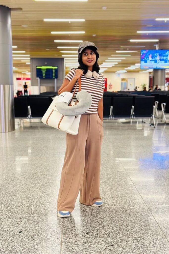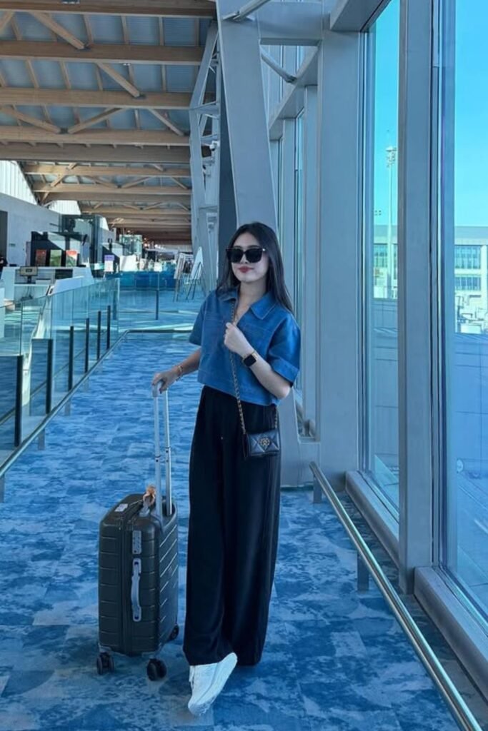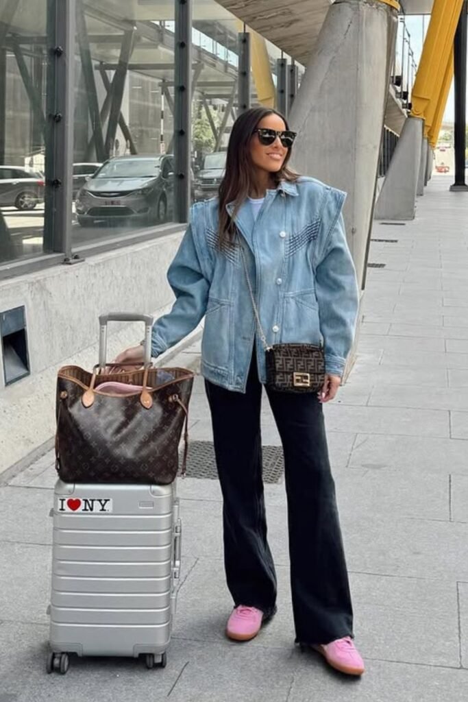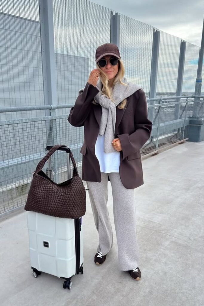 To get this style back, wear a fitted layer with casual pants, keep the colors neutral, and carry a structured bag so the overall ensemble stays neat from gate to gate.
