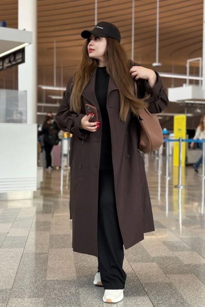 Busy terminals reward outfits that stay sharp without trying too hard. A light trench coat over a white tee and black leggings keeps your look sharp in crowds, during security lines.