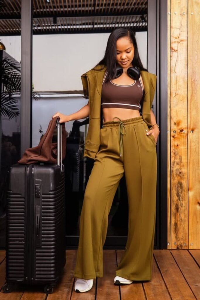 An olive wide-leg jogger with a fitted and top keeps you cool while you walk quickly around the airport. Sleeveless jacket gives you structure without adding heat.