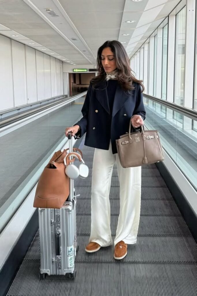 Movement feels smoother when your outfit stays structured instead of slouchy. A blue double-breasted blazer over soft ivory leggings can keep you toasty on jet bridges.