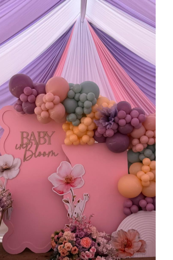 The secret here is layering: fabric for softness, balloons for volume, florals for detail.