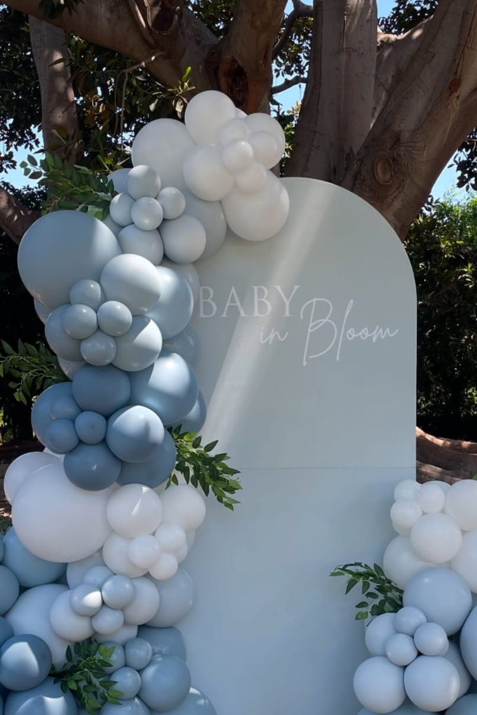 The layered dusty blue and white balloons keep it cohesive, while small touches of greenery prevent it from looking flat.
