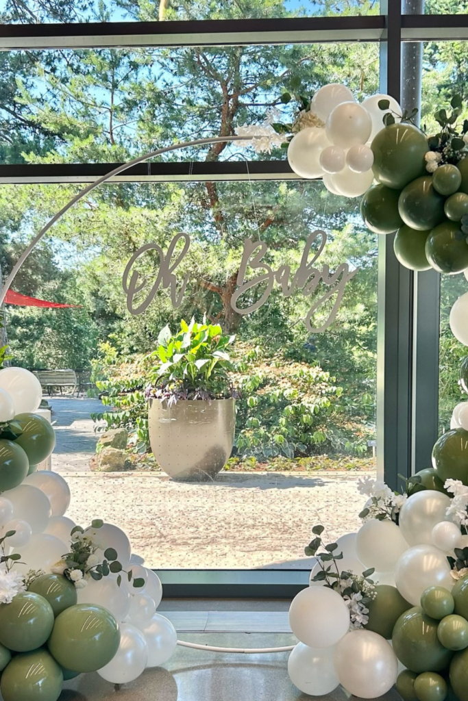 The sage green and white balloon arch feels fresh, especially paired with delicate white florals tucked in between.