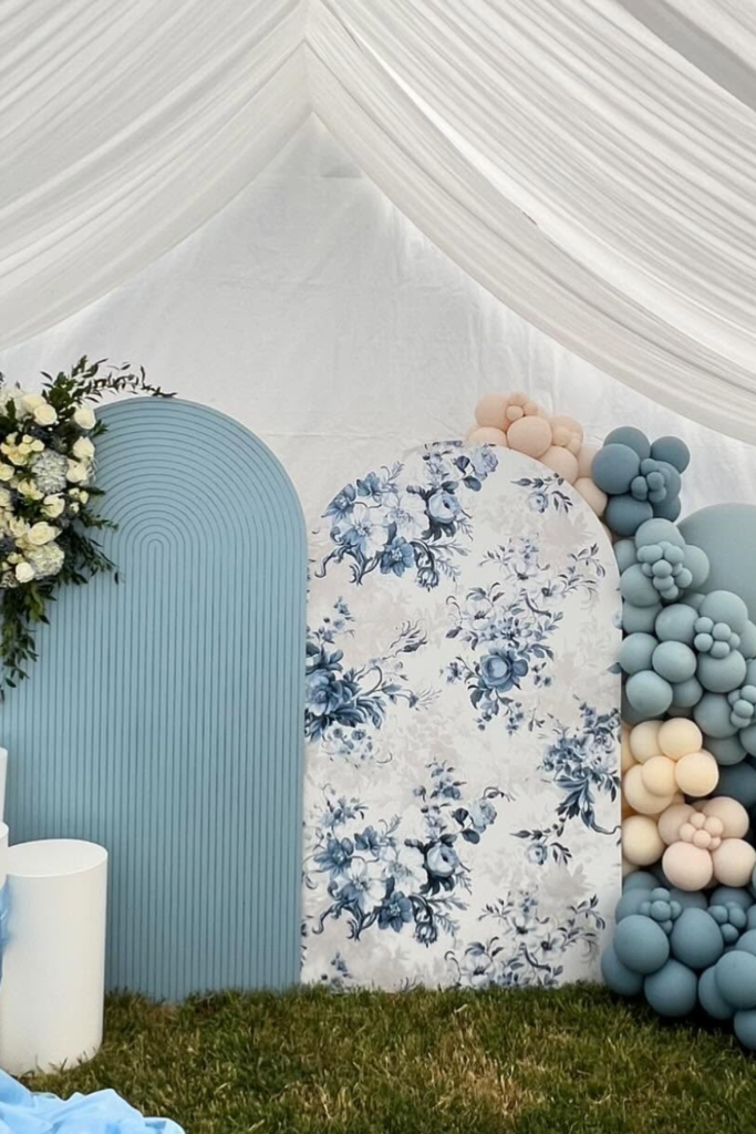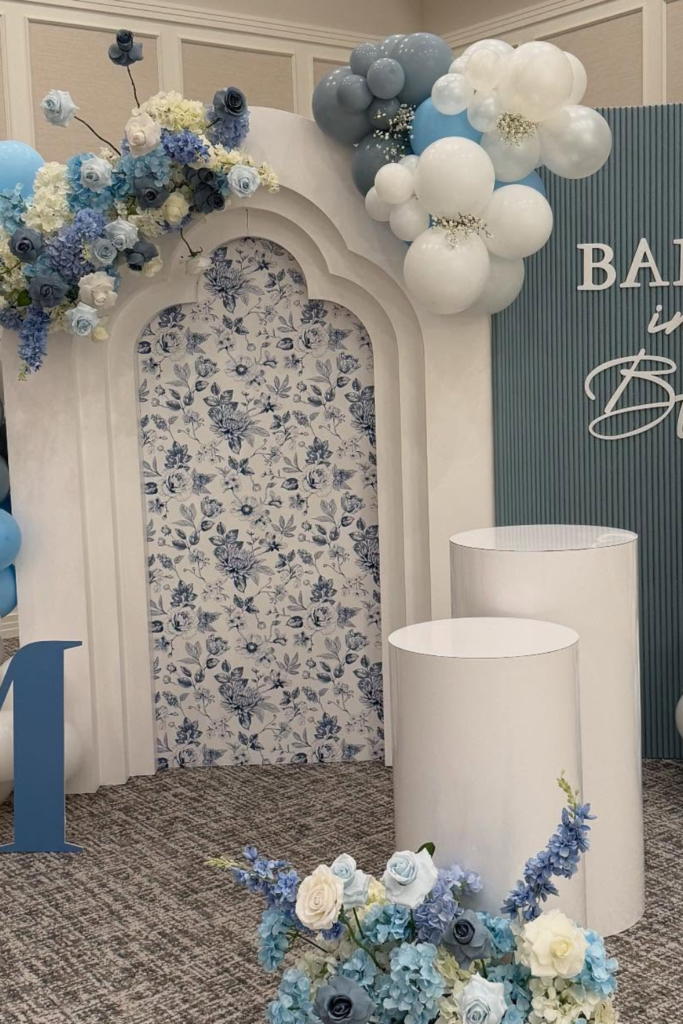 The blue floral toile panel instantly elevates this setup from basic to refined. Instead of relying only on balloons, the patterned backdrop adds depth and visual interest.