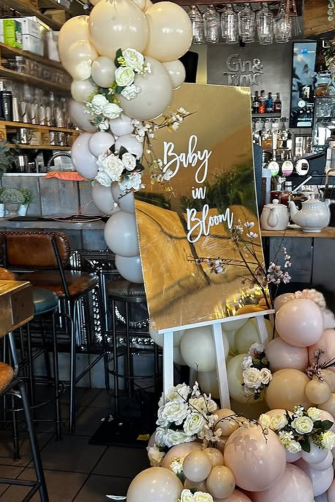 If you love a statement moment, a glowing “Baby in Bloom” sign instantly changes the vibe.