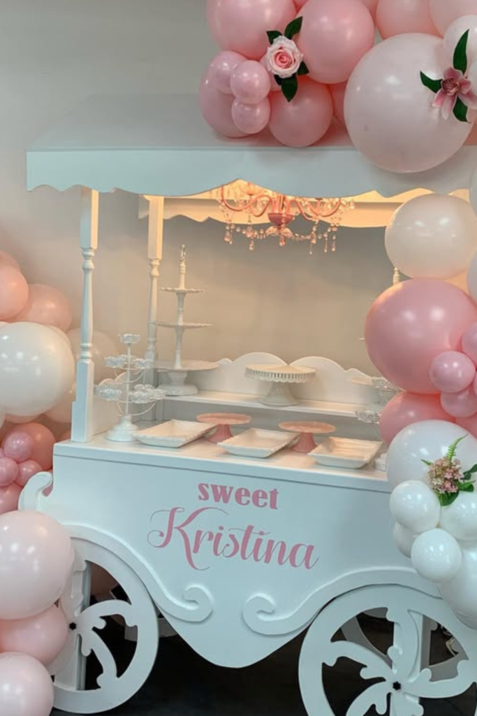 This white cart framed with blush and ivory balloons feels charming and functional at the same time.
