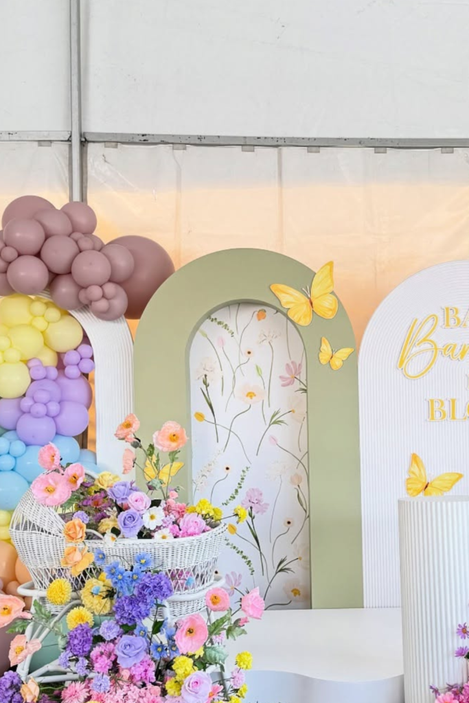 The pastel rainbow balloons instantly bring energy, while the wildflower-inspired florals ground the look so it still feels garden-themed.
