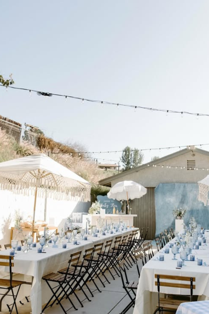 Long white tables, black folding chairs, and soft blue accents create a clean, European-inspired look right in a backyard.