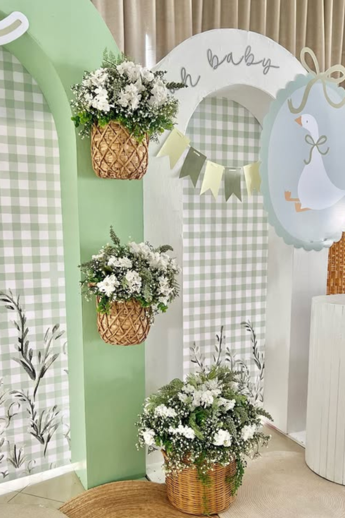 Woven baskets, hanging florals, and subtle duck illustrations keep the space light without overwhelming it.