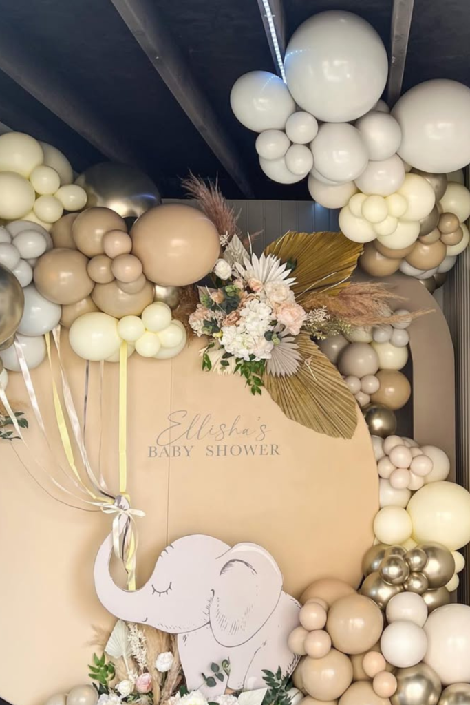 This neutral balloon installation works because it mixes matte, glossy, and metallic finishes within the same beige family.