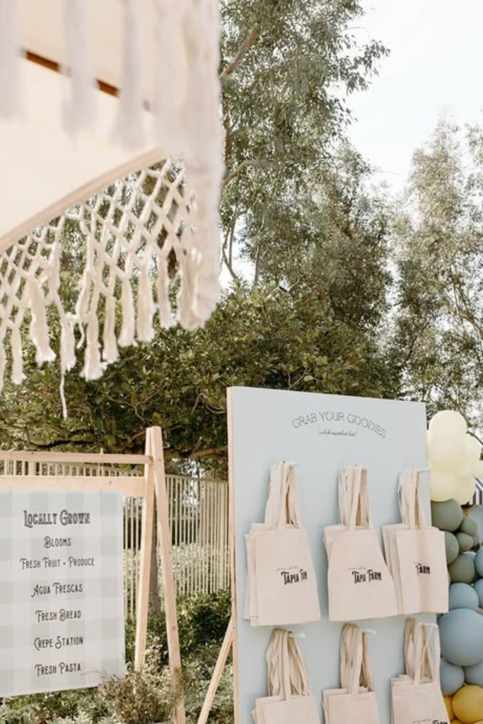 A farmers market theme feels fresh, playful, and creative. Instead of traditional favors, offer tote bags and set up a “grab your goodies” station so guests can collect treats like they’re shopping.