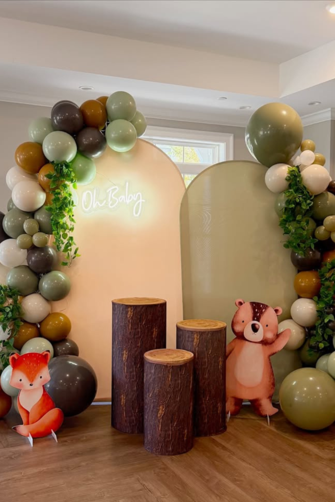 Instead of relying only on balloons, bring in wooden log pedestals and small forest characters to add personality.