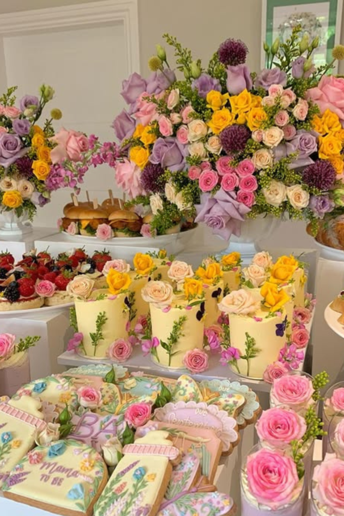 The trick here is consistency-when the florals, desserts, and colors echo each other, the whole display feels intentional instead of chaotic.