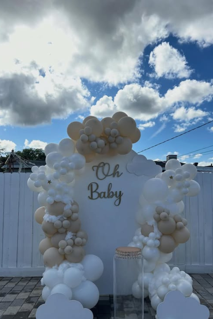 A touch of greenery woven into the balloon arch softens everything and keeps it from feeling heavy.