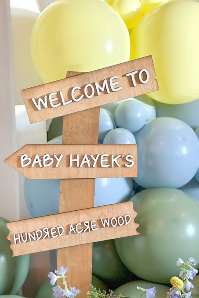 Instead of generic signage, personalize it with the baby’s name and a short phrase that hints at the theme.