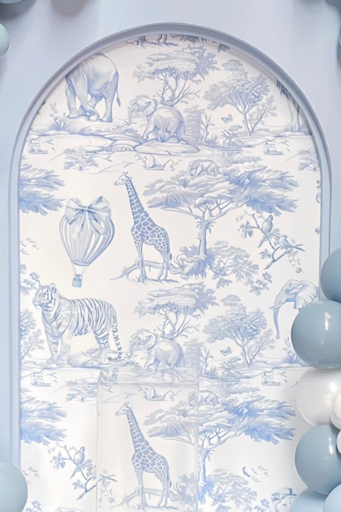If you want a boy-themed shower without going cartoonish, try a toile-style safari print in soft blue.