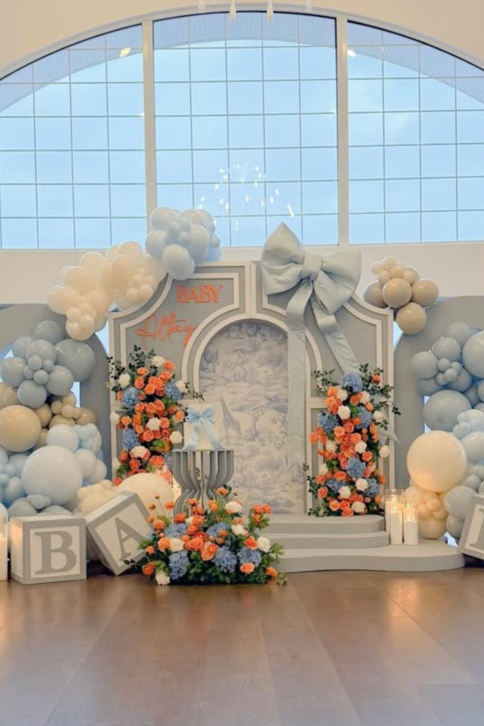This soft blue and cream setup feels grand because everything is layered: oversized bows, balloon clusters, florals, baby blocks, even candlelight at the base.